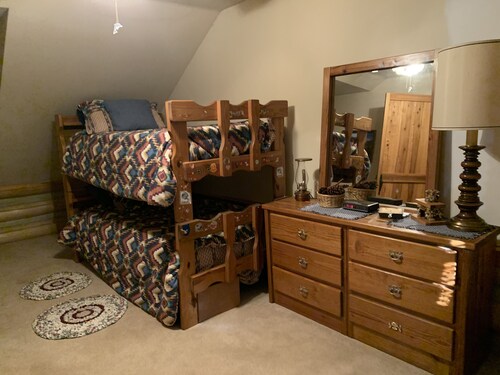 This charming log cabin with a loft, in the black hills of south dakota, is set back in the trees and has a beautiful forested view of the meadow below and of a mickelson trail bridge that crosses newton fork creek.